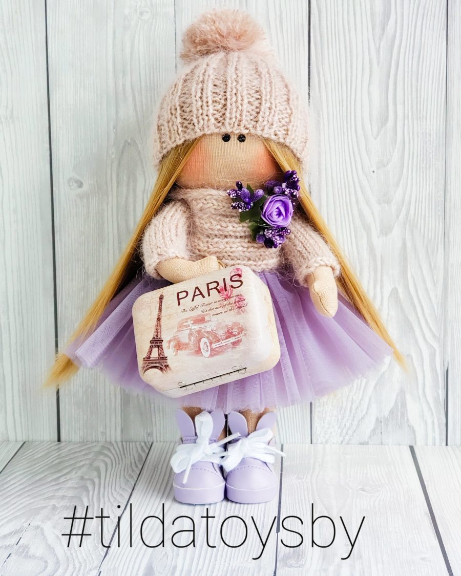 Рост 30 см., стоит самостоятельно, одежда несъемная. В розовом комбинезоне и с серым мишкой в руках. На ногах розовые кеды.Куколка Франсуаз