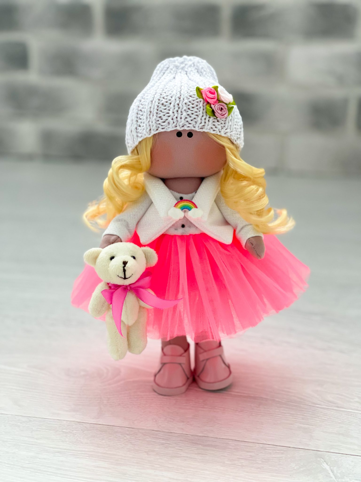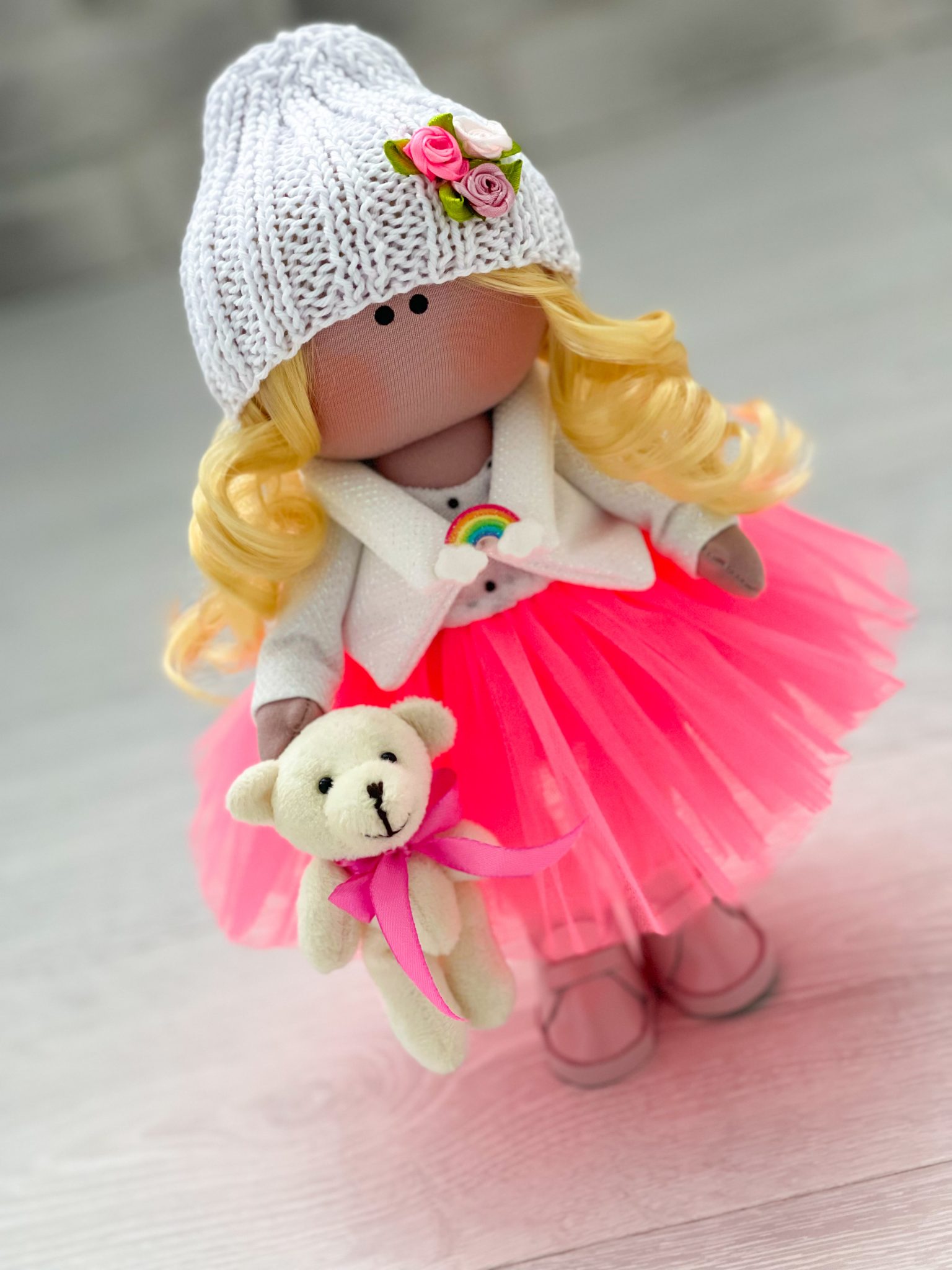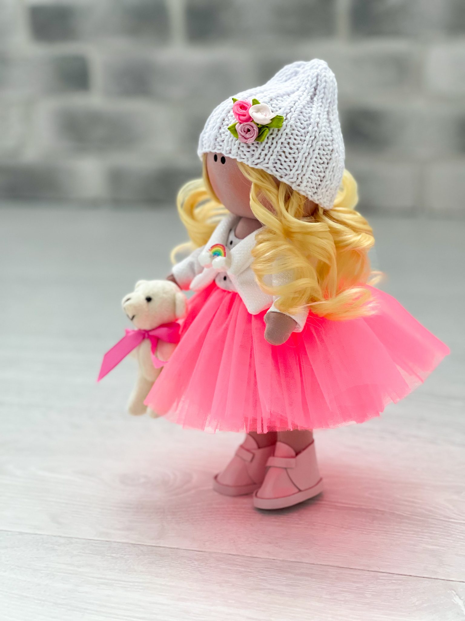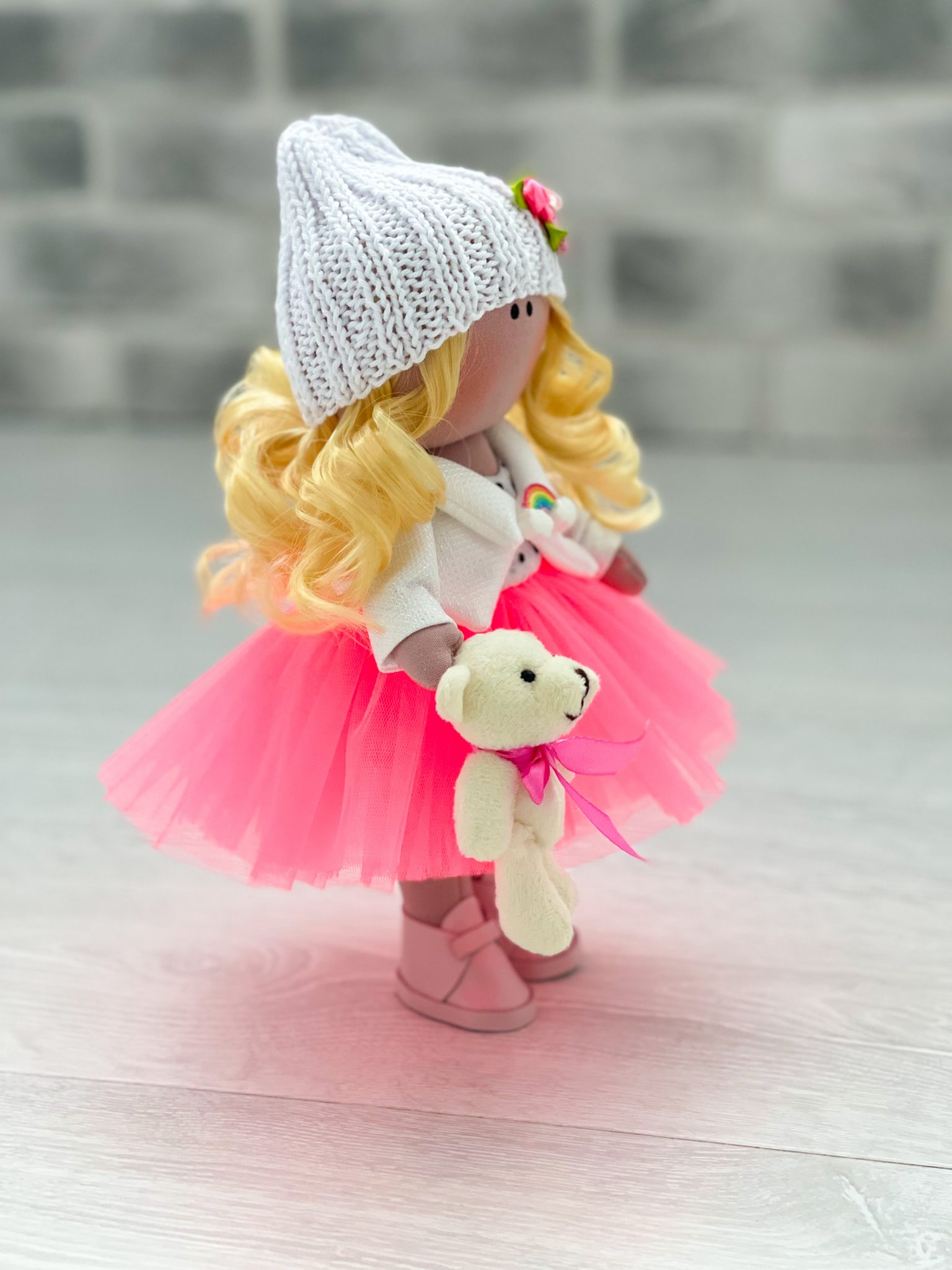Рост 25 см., стоит самостоятельно, одежда несъемная. Куколка в юбке-пачка. На голове белая шапка. В руке мишка. На ногах ботиночки.